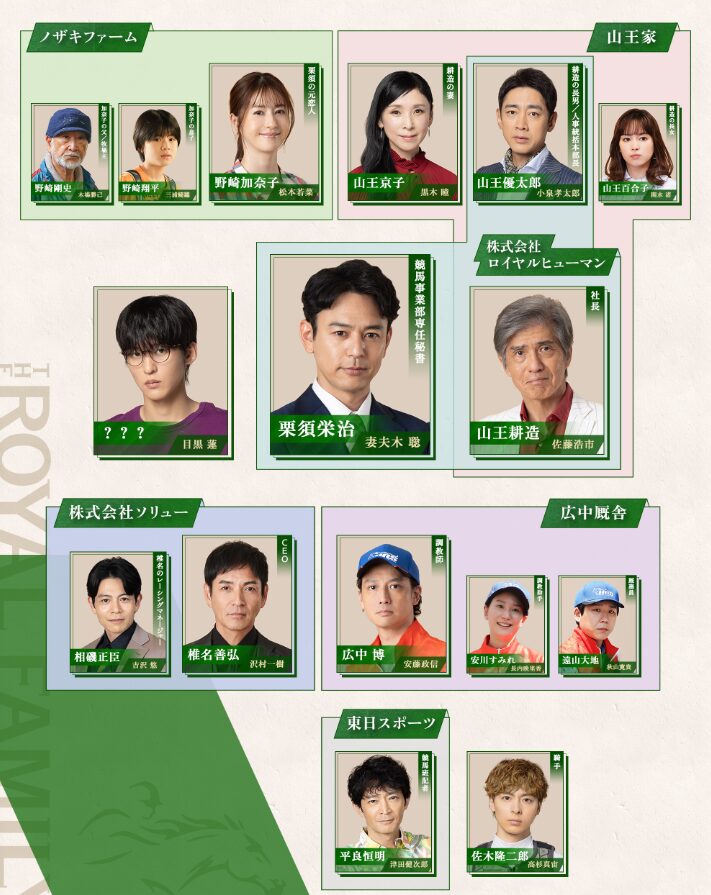 ザ・ロイヤルファミリーには、主人公・栗須栄治(妻夫木聡さん)を中心に、競馬界や家族、企業関係者など多様な人物が登場します。