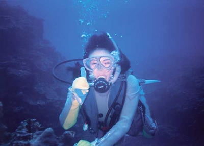 スキューバダイビングでは海中での穏やかな笑顔が印象的で、自然との一体感を楽しむ姿が写真に収められています。